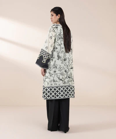 Elevate your style with our two-piece printed raw silk ensemble in black and off white featuring a printed straight shirt with a Y-neckline paired with flared pants.