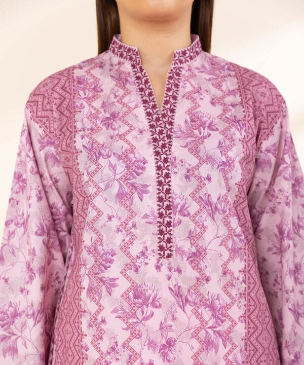 Make a statement with our three-piece embroidered ensemble in pink featuring a lawn shirt, dyed cotton trousers and a blended chiffon dupatta.