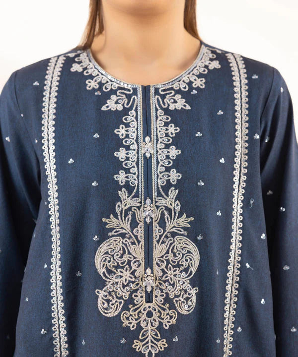 Details: Dyed With Tilla Embroidered And Sequins Front Panel, Dyed Back Panel, Round With Slit Neckline, Full Sleeves, Below Knee Length