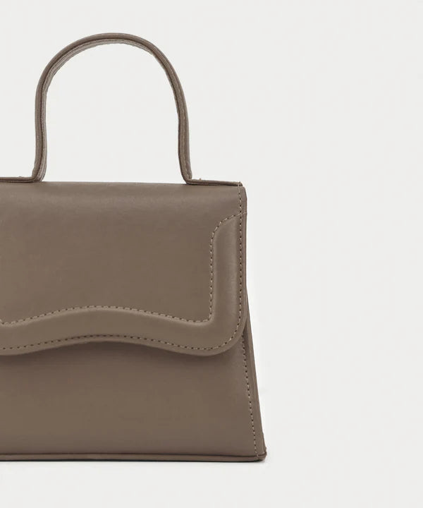 Uplift your style with our beige faux leather, structured mini bag featuring matching suede lining and a shoulder strap.