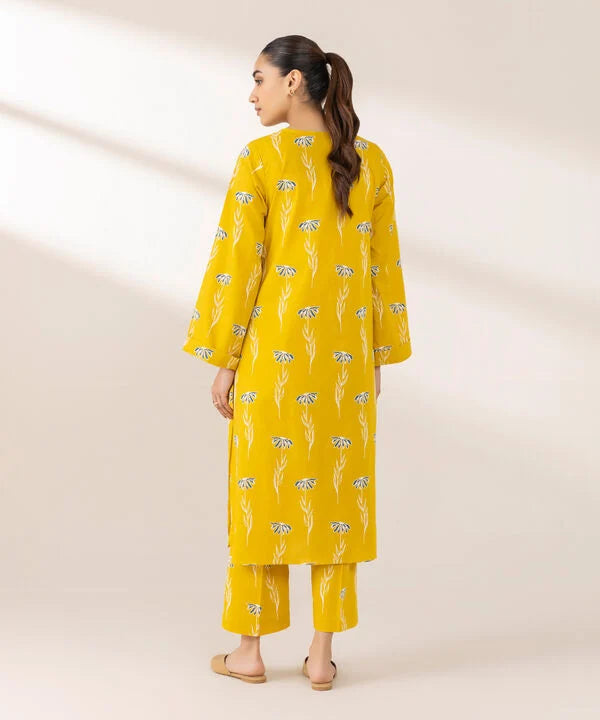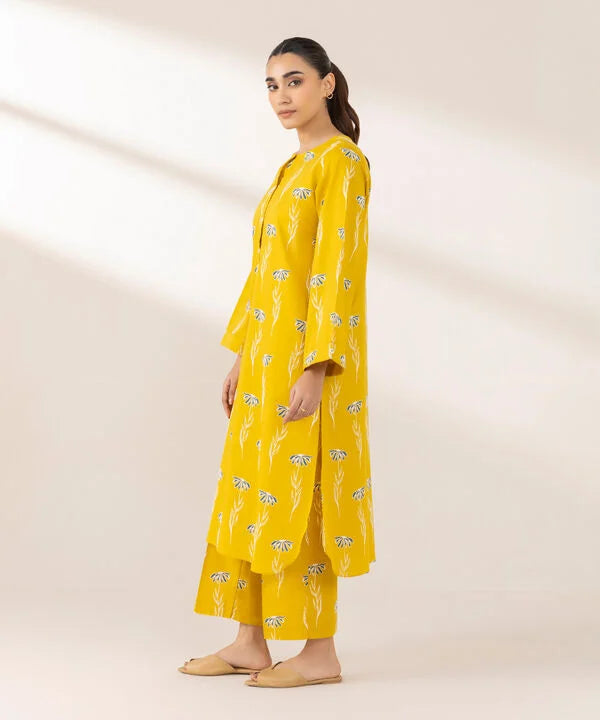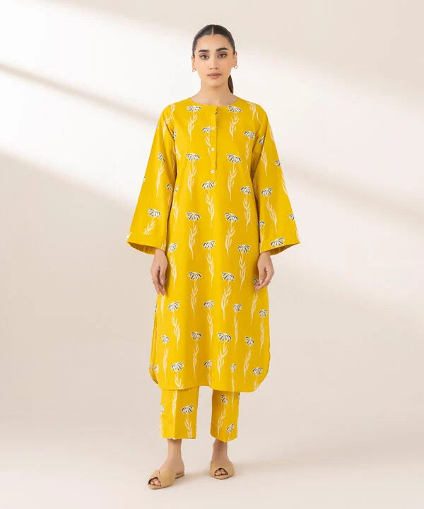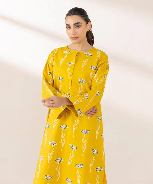 Elevate your style this season in our printed embossed yellow, cambric, straight shirt with a round neckline and placket.