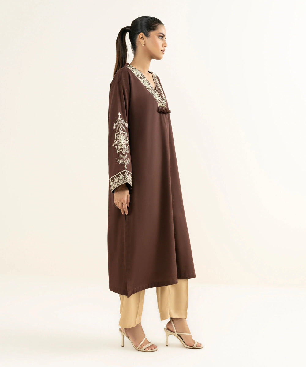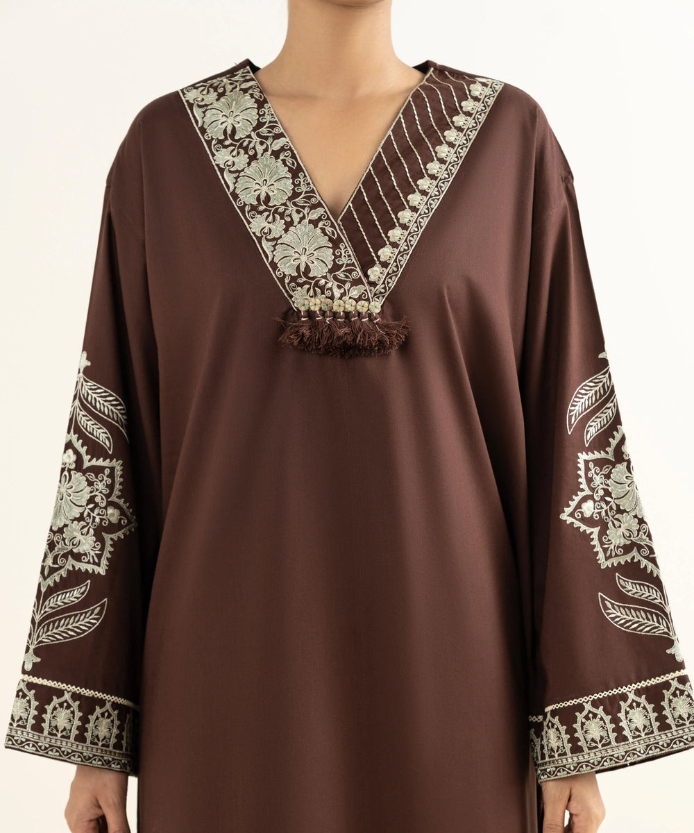 Drop Shoulder ShirtFit: LooseDyed With Embroidered Front Panel, Dyed Back Panel, V Neckline, Full Sleeves, Long LengthColour: BrownFabric: Bedford