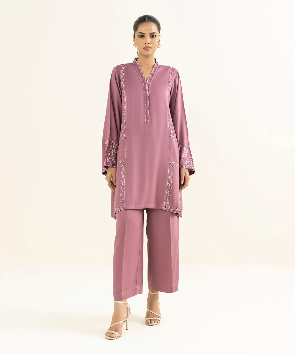Fit: RegularDyed With Embroidered Front Panel, Dyed Back Panel, V Neckline, Full Sleeves, Short LengthColour: PinkFabric: Bedford