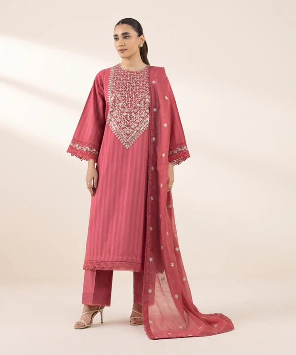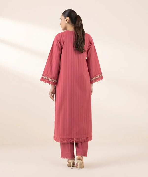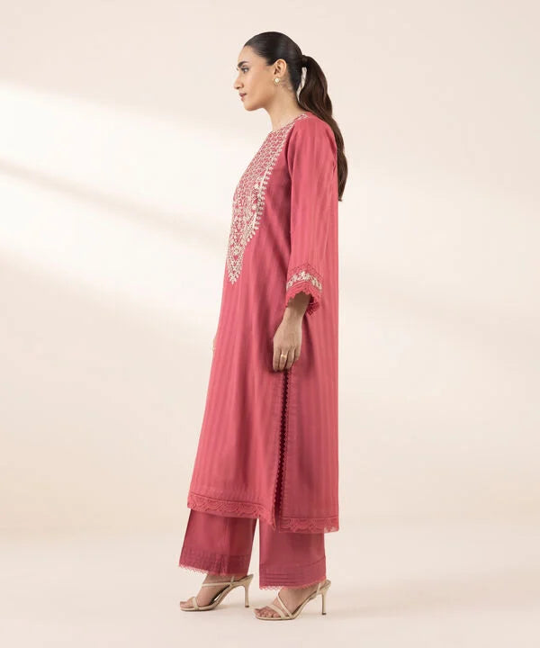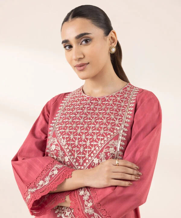 Make a statement with our pink dyed embroidered A-line shirt featuring a round neckline.