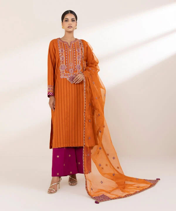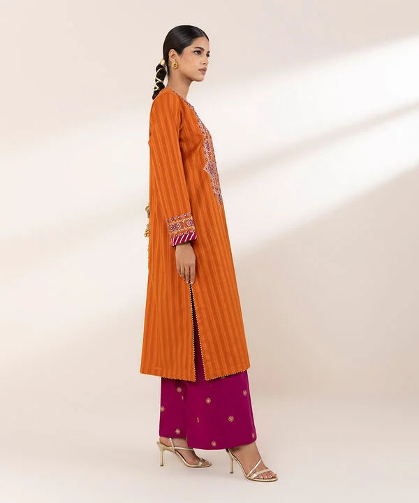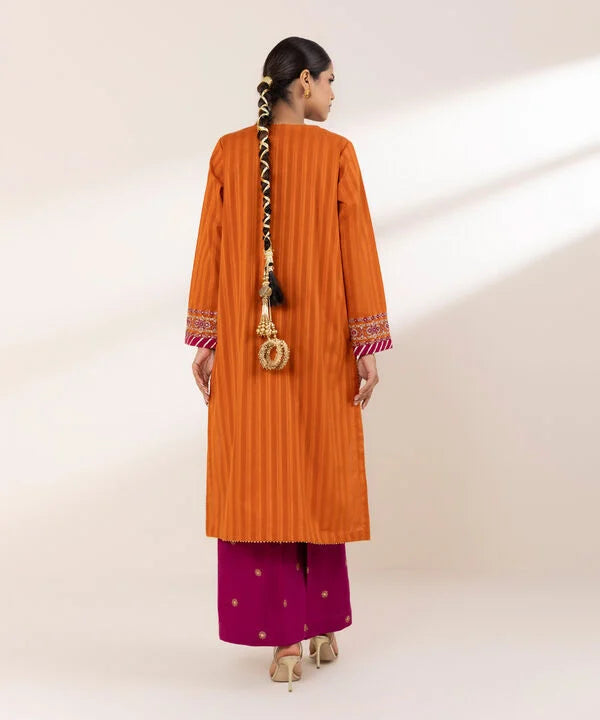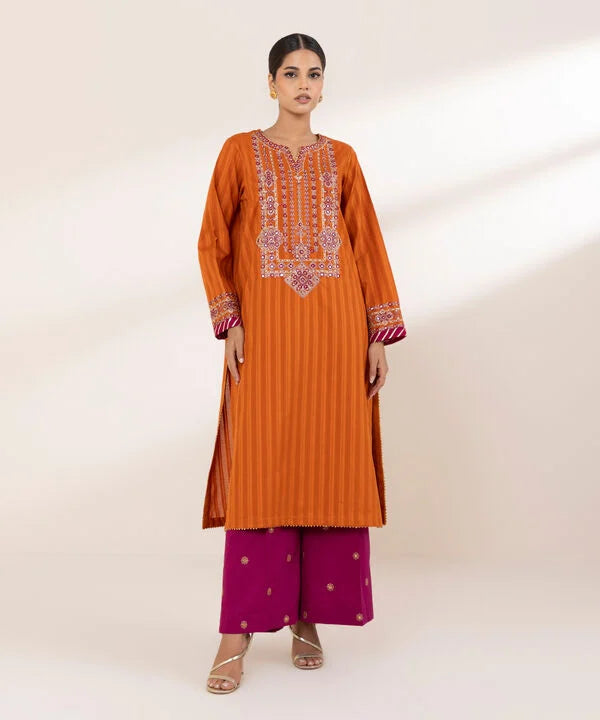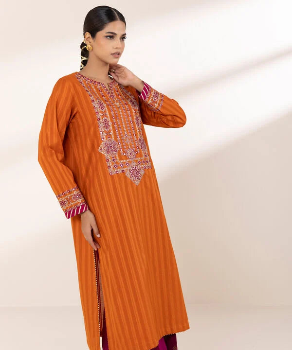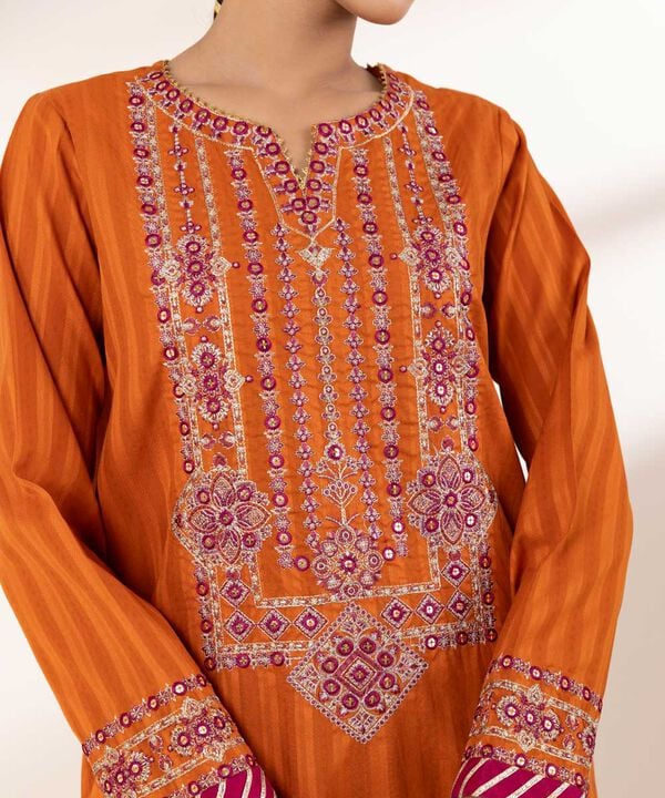 Perfect your festive style with our dyed orange, tilla embroidered A-line shirt featuring a round neckline with a slit.