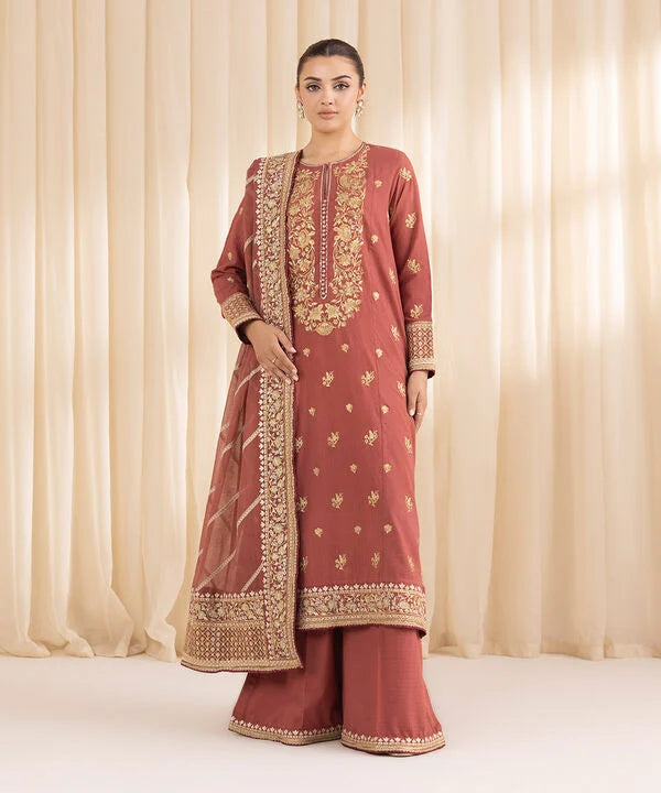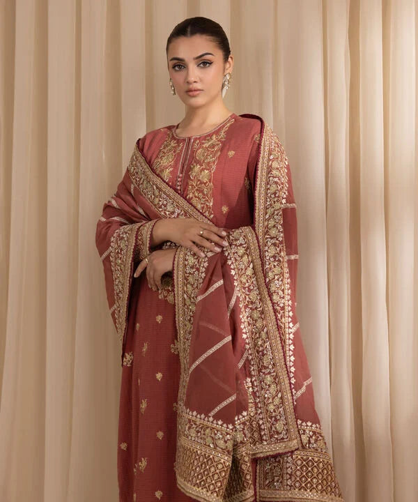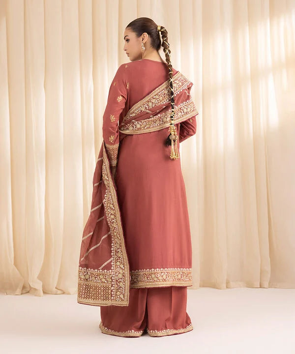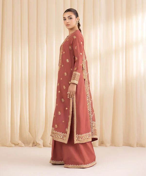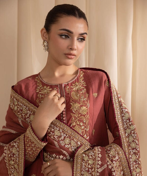 Dyed With Tilla Embroidered Sequins And Lace Finish Front Panel, Dyed With Tilla Embroidered Sequins And Lace Finish Back Panel, Round With Slit Neckline, Full Sleeves, Calf Length