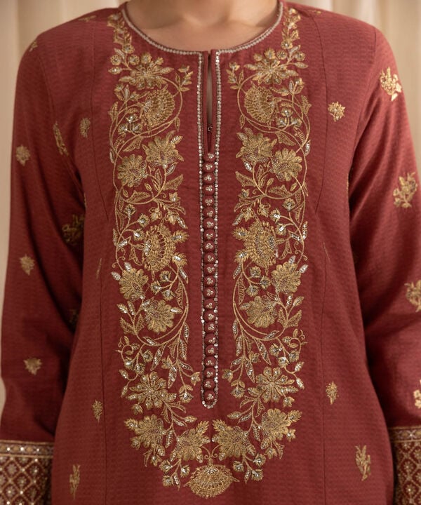 Turn heads this festive season with our rust panelled A-line shirt with a round neckline and a slit.