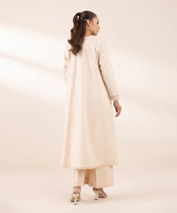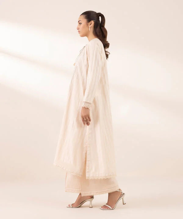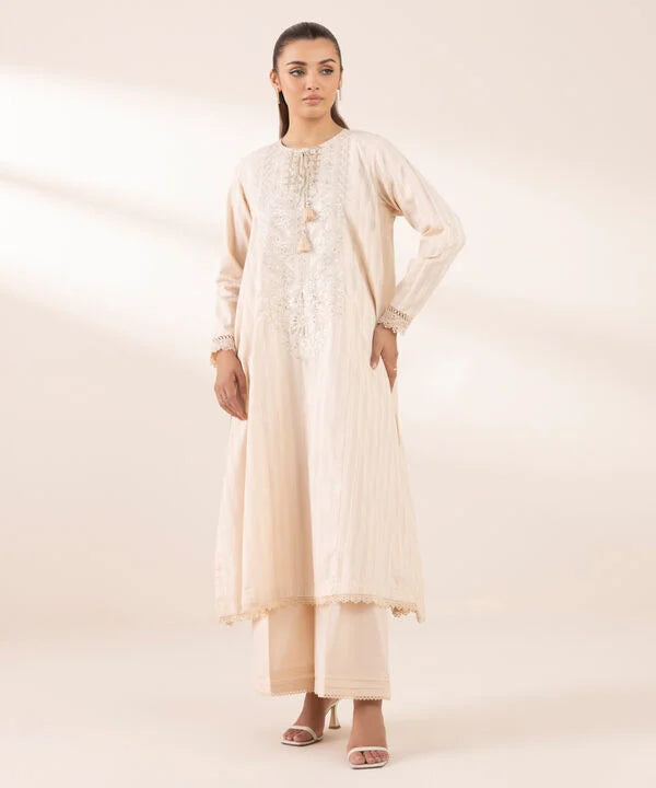 Elevate your style with our pink, tilla embroidered panelled A-line shirt featuring a round neckline with a slit.