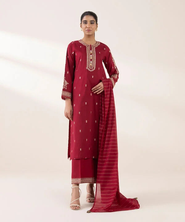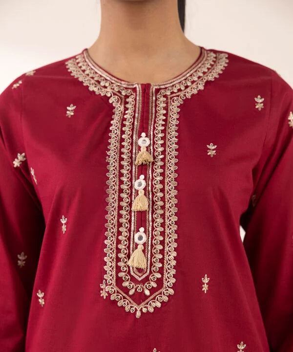 Step out in style in our embroidered maroon lawn A-line shirt with a round neckline and slit.