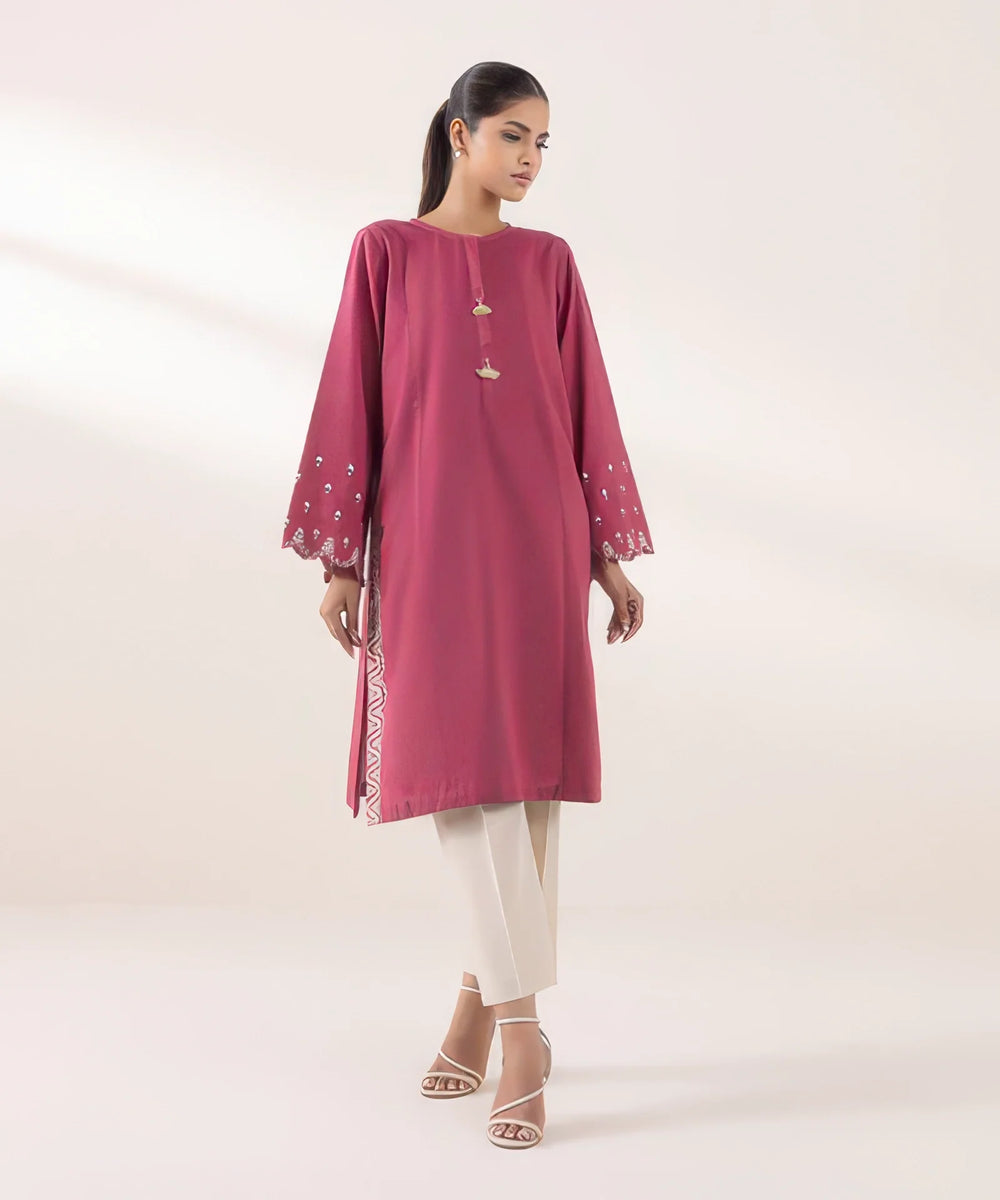 Spruce up your winter closet with our tilla embroidered rosewood pink A-line light khaddar shirt featuring a round neckline with placket and tassels.