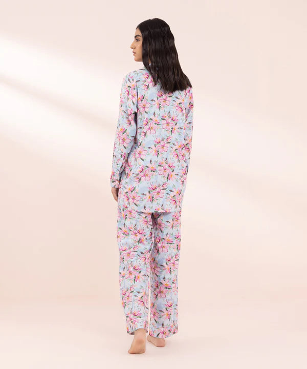 Printed PJ set in soft and breathable fabric. Notch collar and button through opening with contrasting piping. Full sleeves with back drop hem. Loose fit trousers with cuff and contrasting fabric piping and drawcord.