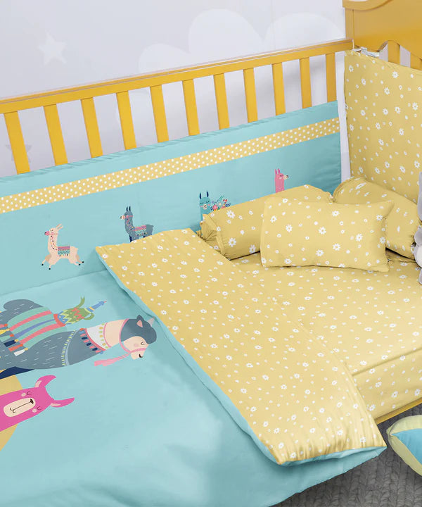 Decorate your little one's nursery with our yellow and blue six-piece baby cot set included with a pillow, fitted sheet, bumper and two neck rolls.
